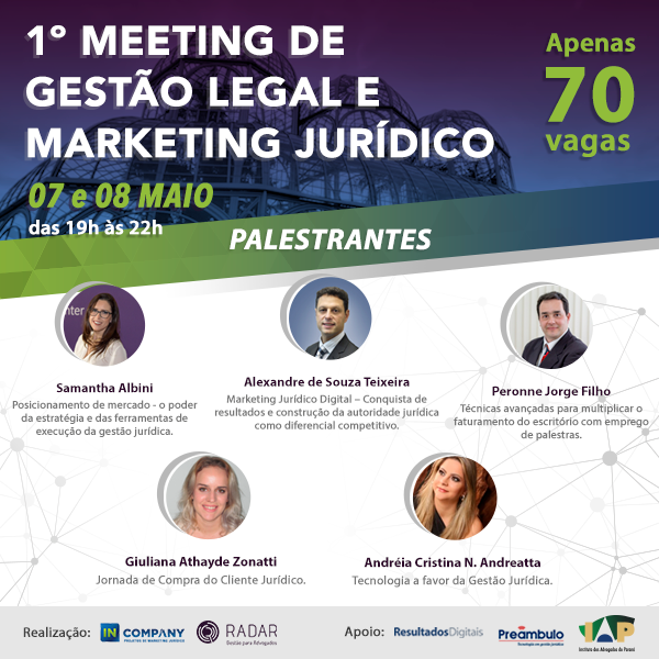 Nos dias 7 e 8 de maio Curitiba sediará o 1º Meeting de Gestão Legal e Marketing Jurídico. O evento será realizado no Instituto dos Advogados do Paraná (Rua Cândido Lopes, 128, 10º andar – Centro, Curitiba).