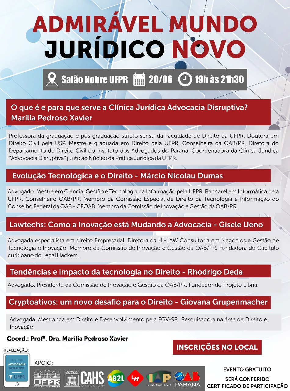 O Instituto dos Advogados do Paraná está apoiando o evento “Admirável Mundo Jurídico Novo”, que será realizado no Salão Nobre da Universidade Federal do Paraná (UFPR) no próximo dia 20 de junho, às 19h.