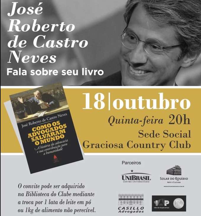 É esse o nome do livro do Professor Doutor José Roberto de Castro Neves a ser lançado na próxima quinta-feira, 18 de outubro, às 20h, no Graciosa Country Club. Combinado com conferência do autor, o lançamento, que integra o ciclo “Pensando o Brasil”, é realizado pelo clube em parceria com o Instituto dos Advogados do Paraná, o Solar do Rosário e o escritório Casillo Advogados. O evento conta ainda com o apoio do Unibrasil Centro Universitário.