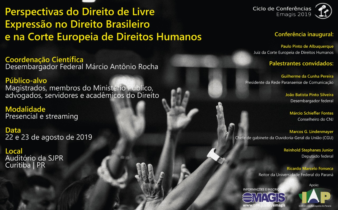 O Instituto dos Advogados do Paraná (IAP) é o apoiador do ciclo de conferências “Perspectivas do Direito de Livre Expressão no Direito Brasileiro e na Corte Europeia de Direitos Humanos”, promovido pela Escola de Magistratura (Emagis). O evento será realizado nas modalidades presencial e streaming, nos próximos dias 22 e 23 de agosto, no auditório da Seção Judiciária do Paraná.