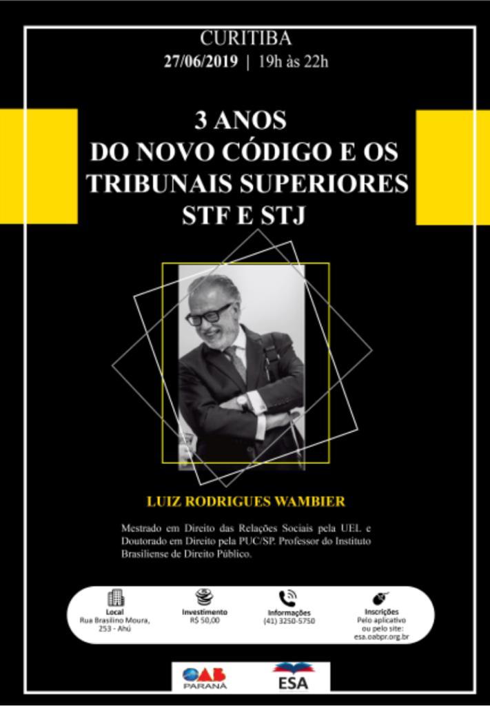 O associado e conselheiro do Instituto dos Advogados do Paraná (IAP) Luiz Rodrigues Wambier ministrará, nesta quinta-feira (27/06), uma palestra com o tema “3 anos do Novo Código e os tribunais superiores STF e STJ”. O evento terá início às 19h na sede da OAB Paraná (Rua Brasilino Moura, 253 – Ahú). As inscrições custam R$ 50 e podem ser feitas no site www.esa.oabpr.org.br.