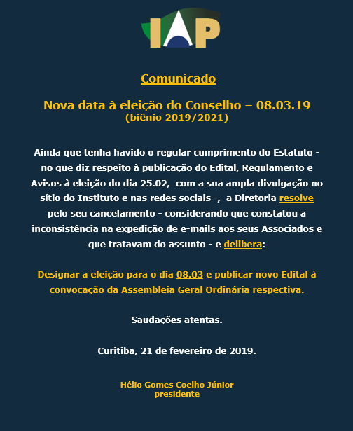 11 de setembro de 2017O INSTITUTO DOS ADVOGADOS DO PARANÁ, por sua Diretoria de Revista, CONVOCA todas as pessoas interessadas, especialmente aos membros integrantes…