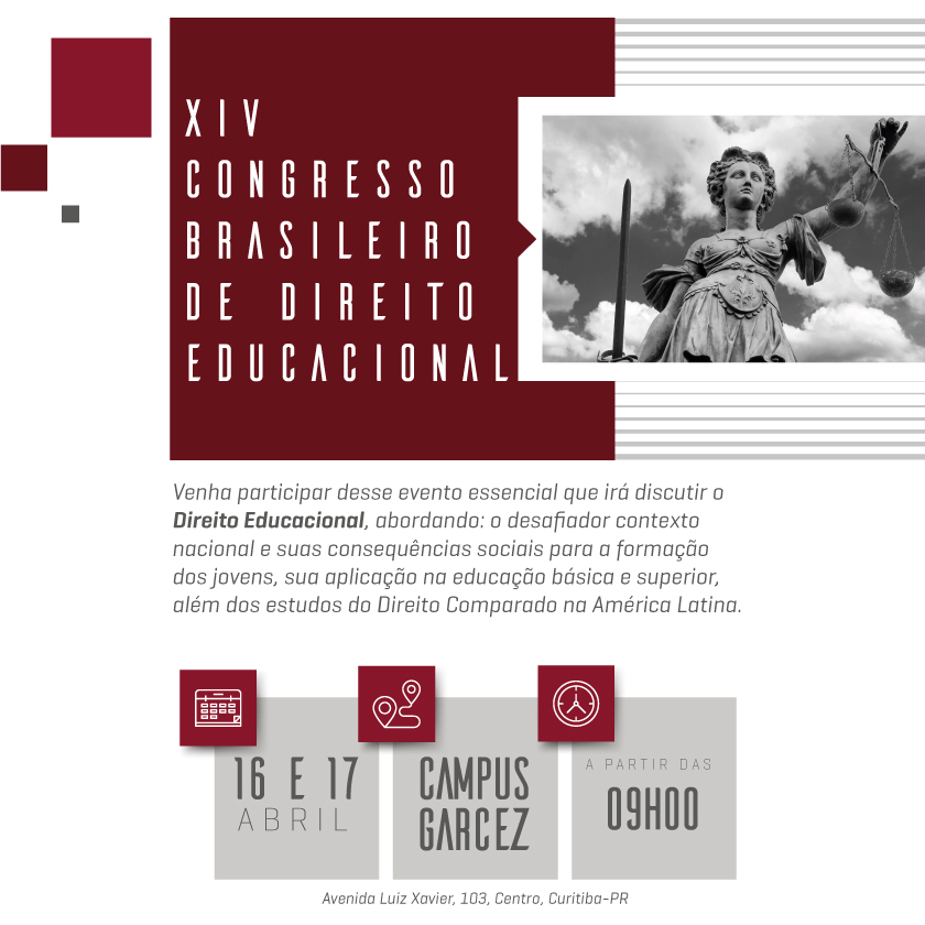 O XIV Congresso Brasileiro de Direito Educacional será realizado nos dias 16 e 17 de abril no Campus Garcez do Centro Universitário Internacional (Av. Luiz Xavier, 103, Centro).